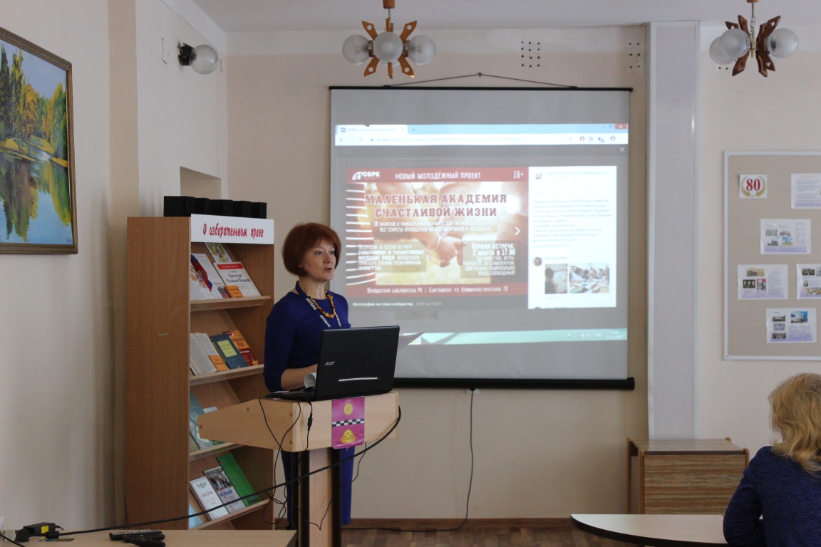 Второй час ведущий методист Елена Геннадьевна Ракина выступила с темой: «Молодые семьи - читатели и друзья библиотеки» и познакомила с работой клубов, которые функционируют в Юношеской библиотеке. Их на сегодняшний день 16. Еженедельно собираются клубы, проходят встречи, игротеки и лекции: клуб любителей комиксов и сериалов «Комикс-лига», клуб любителей настольных игр «Игрополис», дискуссионный клуб «Уникальное время», интеллектуальная командная игра «ЧеховъQuiz», клуб «Читающий четверг», где в последний четверг месяца собирается молодежь и читают вслух какое-либо произведение или стихи собственного сочинения. Второй год работает семейный клуб «Маленькая академия счастливой жизни», куда приходят семейные пары, чтобы пообщаться и поделиться опытом, как быть счастливыми в этой жизни. В клубе проходят беседы, тренинги, фотосеты, мастер-классы, ароматные чаепития. Добрые книги и песни радуют всех участников вечера.